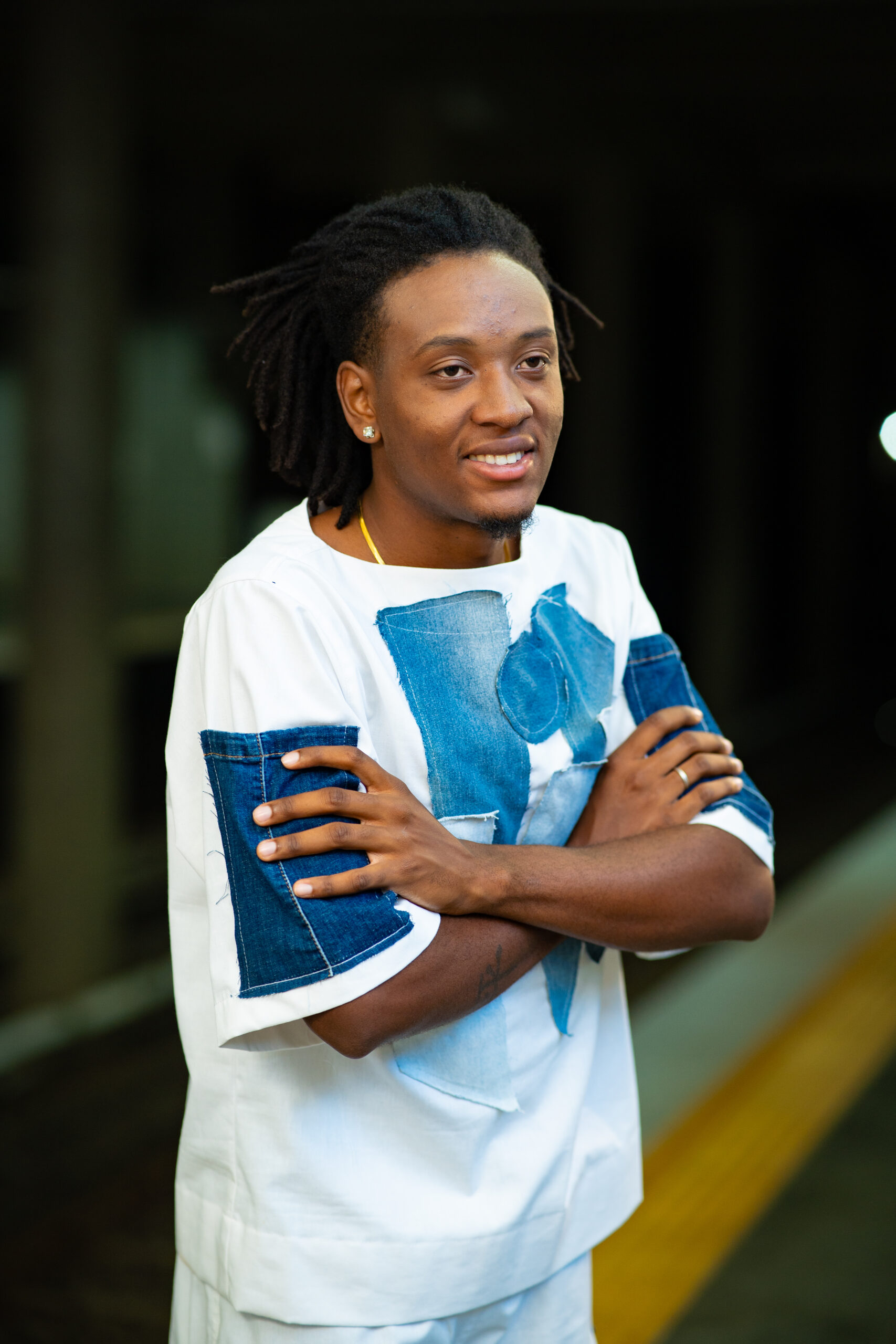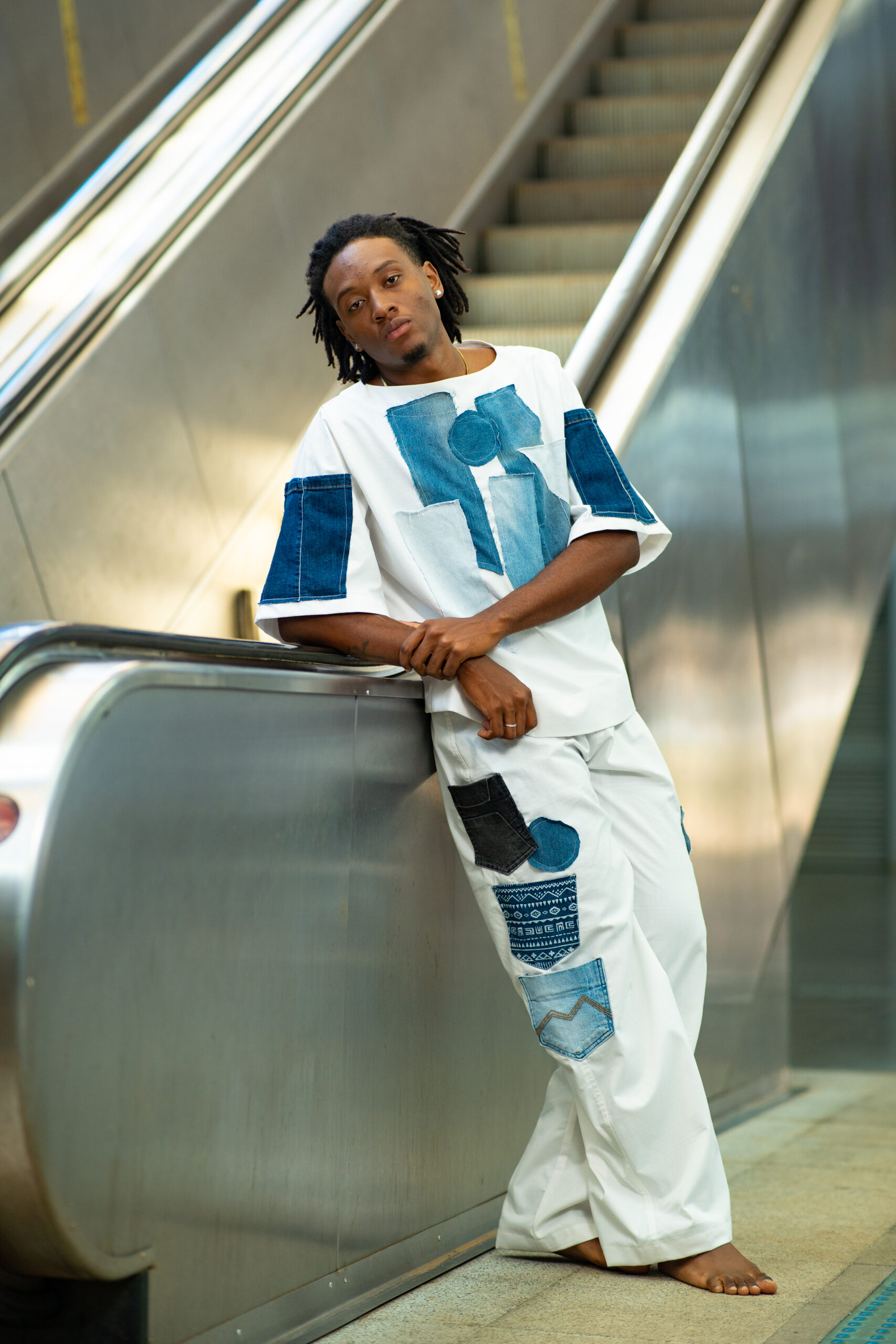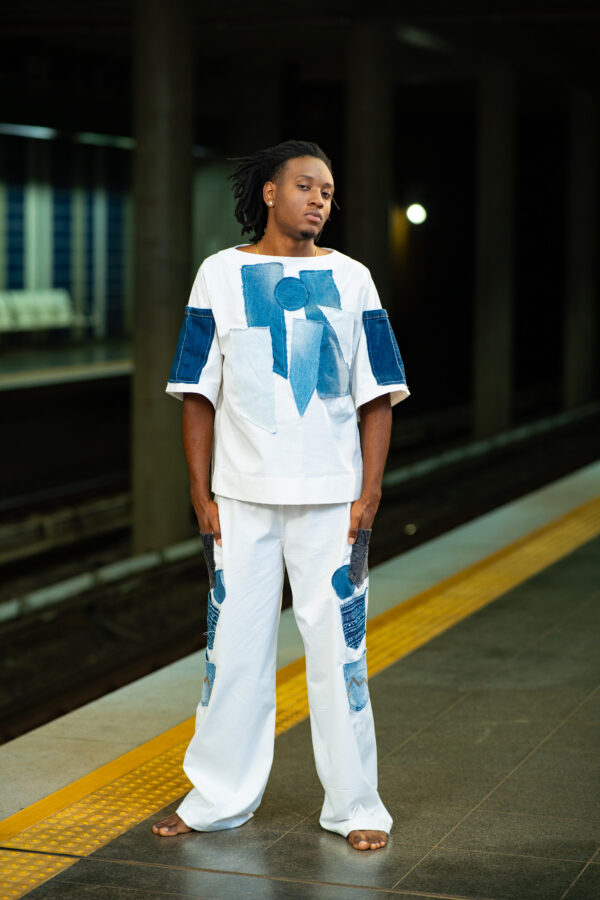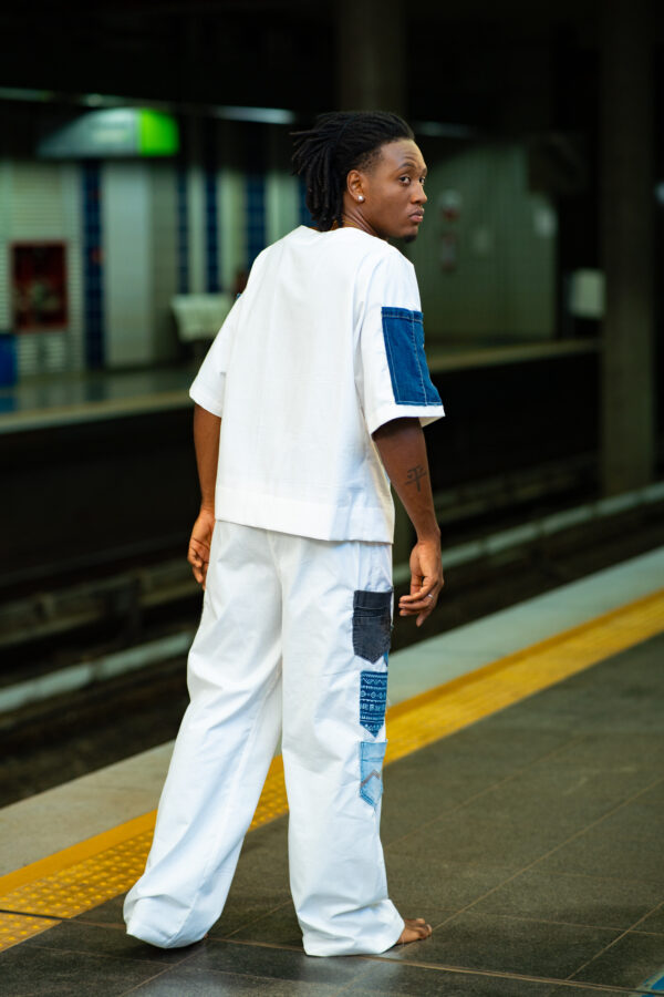Camisa em sarja branca com aplicações em jeans.
