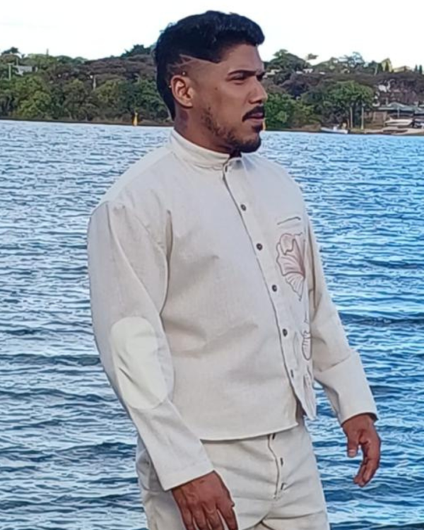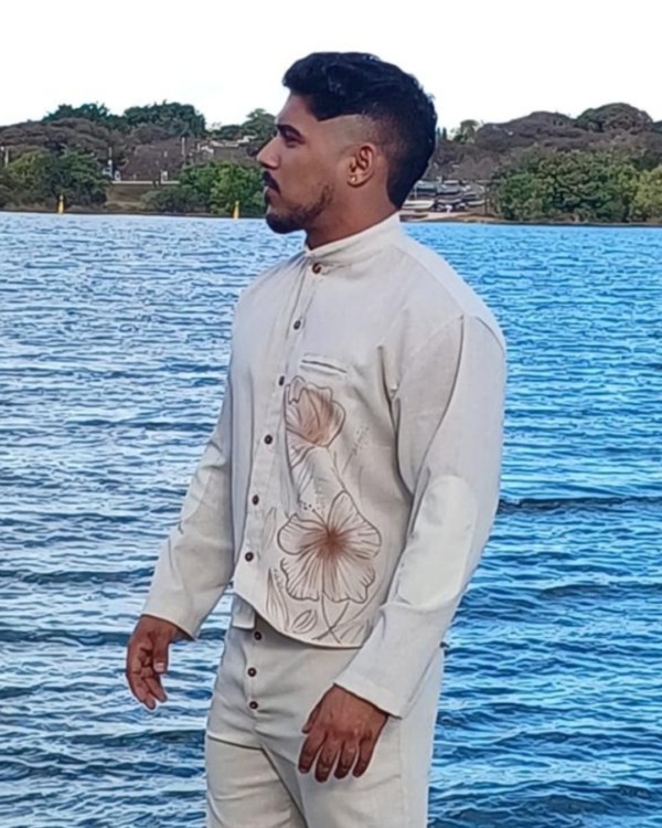 Camisa em linho rustico com detalhes em couro ecológico nos cotovelos, gola estilo indiano botões de madeira e grafite na lateral.