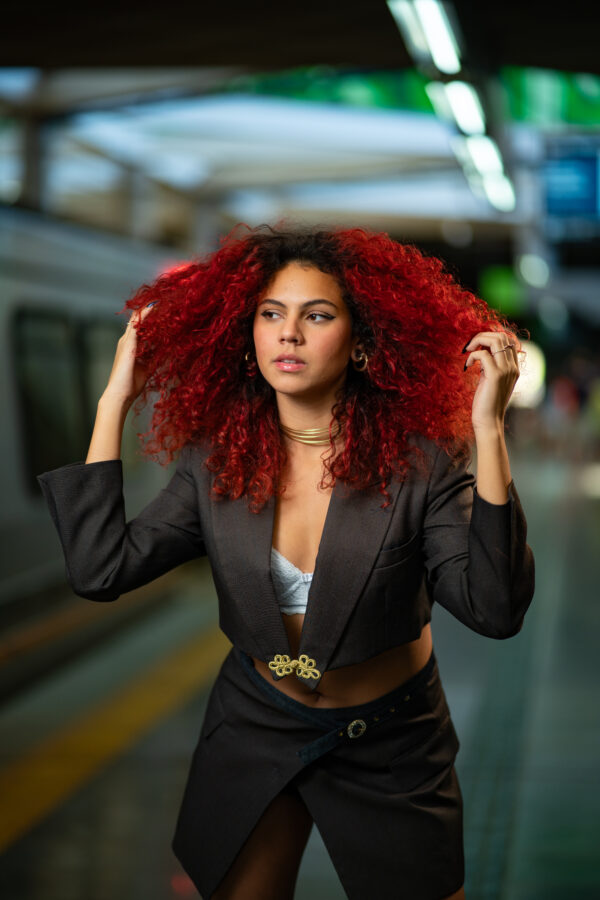 Conjunto de blazer cropped e saia, com destaque para as imponentes asas douradas aplicadas.