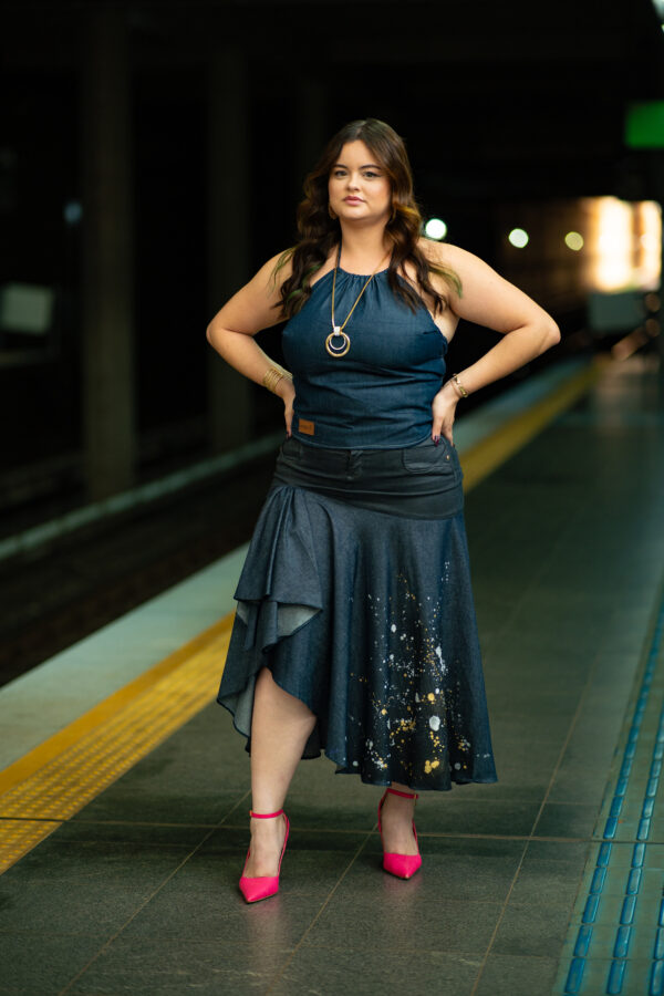 Top corset upcycling com fechamento em cordão dourado, modelo São Francisco.