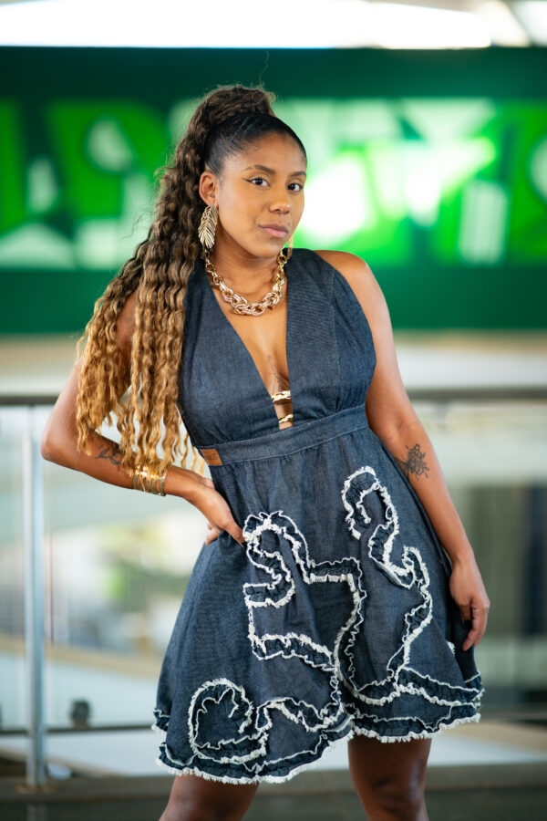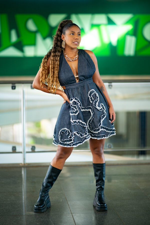 Vestido em jeans chambray com costas assimétricas. quantidade